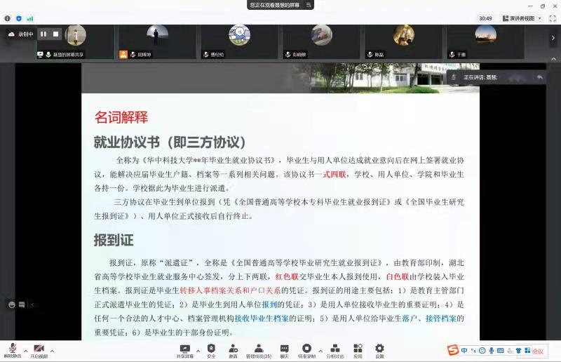 会议开始,聂慧首先分析了学院各专业重点就业方向与就业单位,帮助毕业生们进一步了解了就业形式;她详细讲解了三方协议的签订流程以及档案、报到证等派遣工作要求,重点强调了关于违约的后果与相关流程,提醒同学们签约时一定要慎重,非必要情况尽量不要违约。
