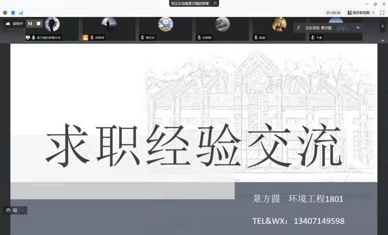 2022届就业工作正如火如荼展开,为帮助学生明确就业意向,提高就业能力,规范就业行为,9月28日晚上,环境学院通过腾讯会议线上召开“第十六期求职大讲堂——硕士毕业生专场”。会议邀请了环境学院2021届就业德育助理聂慧、中国建筑国际集团2021届海之子张志冲、武汉市政设计院给排水工程师邹瑜佳、远洋地产工程管理专员曾现宏、中国三峡集团员工景方圆与毕业生们在线交流就业择业心得。