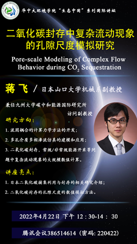 2022年4月22日下午,应我院郭利民教授的邀请,日本山口大学机械系副教授蒋飞为我院师生做“二氧化碳封存中复杂流动现象的孔隙尺度模拟研究”的学术讲座。讲座由郭利民教授主持,环境学院徐新华副院长、王松林教授、王飞飞副教授、蔡磊博士等20余名师生出席本次交流活动。