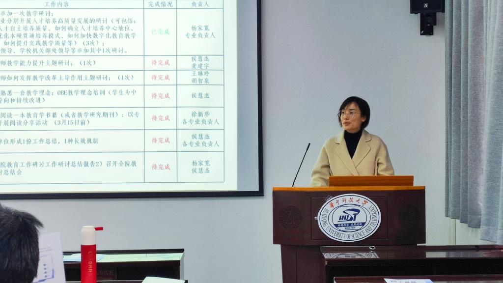 会上,侯慧杰副院长向与会人员汇报了我院以“6个1”为核心内容的教育教学研讨方案实施进展情况。学院专项工作组成员围绕育人成效调研、课堂教学观摩、教学大纲修订等下阶段工作的具体安排进行了研究讨论。