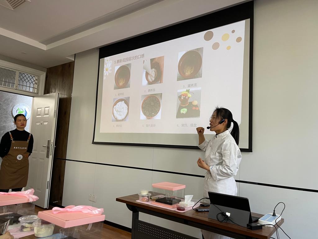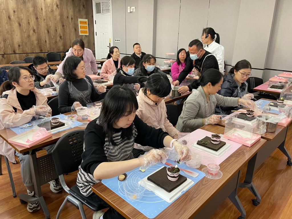 主题活动培训老师提前给大家准备了蛋糕胚底、手工巧克力、马卡龙和慕斯馅等原材料,现场讲解了慕斯花园盆栽的制作步骤,老师们也迫不及待的跟随老师的讲解开始动手操作起来。老师们兴致勃勃、各显神通,创意制作了自己专属的美丽的慕斯花园。