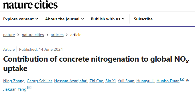 《自然》子刊Nature Cities在线发表了题为“全球尺度混凝土固氮对NOx吸收的贡献”(Contribution of concrete nitrogenation to global NOxuptake)的最新研究成果。我校环境学院为论文通讯作者单位,第一作者为德国德累斯顿工业大学/莱布尼兹生态城市与区域发展研究所博士生张宁,我校环境学院段华波副教授和杨家宽教授为共同通讯作者。