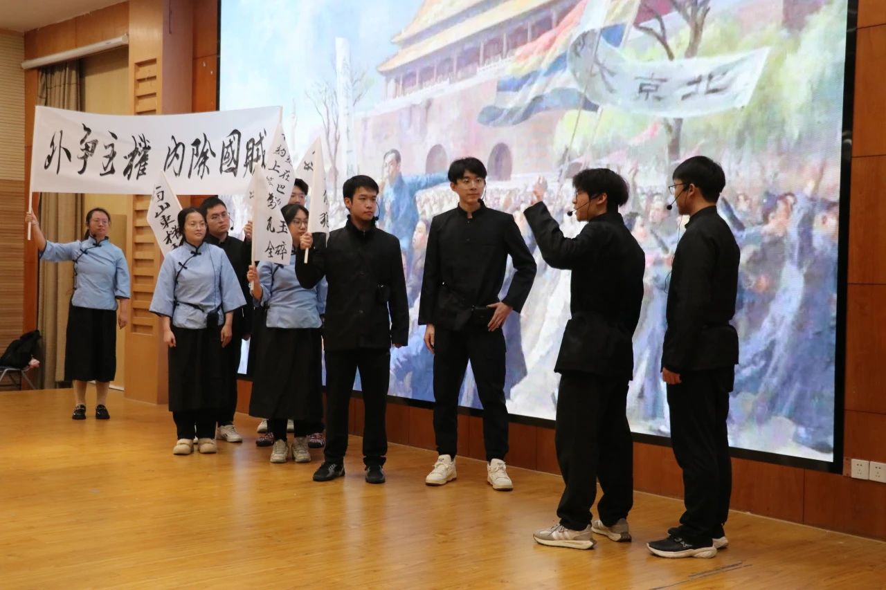 活动现场气氛热烈,节目精彩纷呈。研究生第四党支部的短剧《破晓》率先登场,生动再现了五四运动时期青年学生们为争取国家主权,外争主权、内除国贼的热血场景,展现了先辈们英勇无畏的精神风貌,让红色记忆的火种在现场熊熊燃烧。