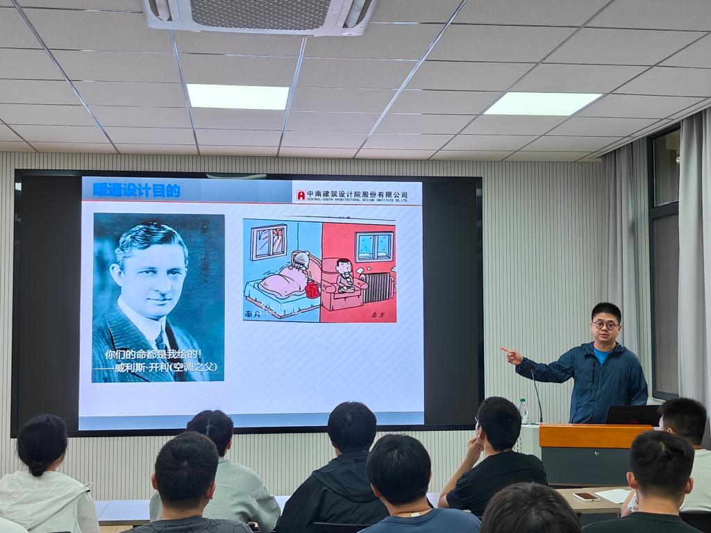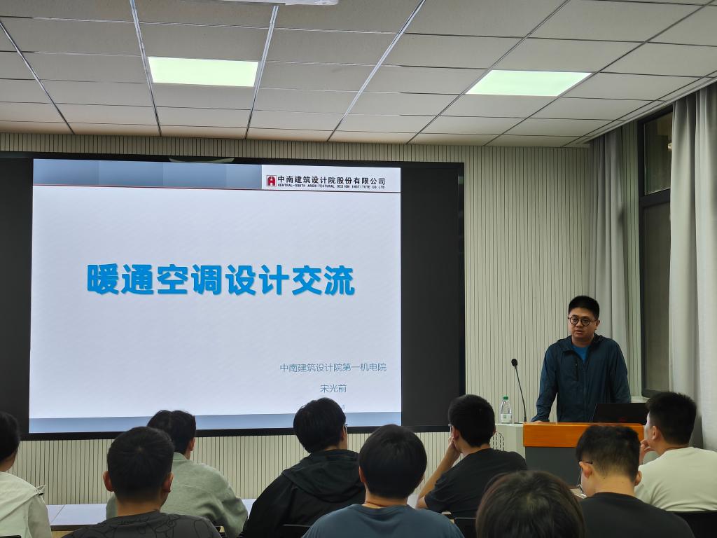2025年4月21日上午,中南建筑设计院第一机电院暖通设计室主任宋光前先生在东31楼401会议室为建环本科生作《暖通空调设计交流》讲座。金健老师主持讲座,刘鹏老师参加讲座。