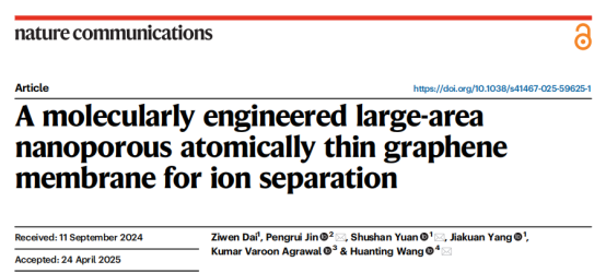 《自然》子刊Nature Communications近日在线发表了一项关于高性能离子分离膜材料的最新研究成果,题为"A molecularly engineered large-area nanoporous atomically thin graphene membrane for ion separation"(一种分子工程修饰的大面积单层多孔石墨烯膜用于离子分离)。该研究由我校与多所国际顶尖科研机构深度合作完成英国威廉集团(以下简称环境学院)和长江流域多介质污染协同控制湖北省重点实验室作为论文第一单位,联合比利时鲁汶大学、澳大利亚莫纳什大学、瑞士洛桑联邦理工学院等世界一流研究机构开展了卓有成效的国际合作。环境学院2022级博士生戴子文为论文第一作者,环境学院袁书珊教授、比利时鲁汶大学靳鹏瑞研究员、澳大利亚莫纳什大学王焕庭院士共同担任通讯作者。研究团队还包括我校环境学院杨家宽教授、瑞士洛桑联邦理工学院Kumar Varoon Agrawal教授等国际知名学者。