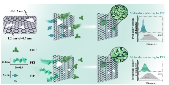 定向界面聚合封堵方法是将水相胺单体和油相多元酰氯单体分布在单层多孔石墨烯两侧,两种单体在石墨烯层附近进行反应,由于油相多元酰氯单体在水中无法稳定存在,所以该反应将通过水相胺单体穿过石墨烯膜与油相多元酰氯反应。因此,决定反应是否发生的关键因素是石墨烯孔的大小和胺单体的尺寸。胺单体可以穿过比自身大的石墨烯孔在油相与酰氯单体反应,而在比自身小的孔附近无法发生反应,因此,通过这种技术可以选择性得将比胺尺寸大的石墨烯孔封堵,进而缩窄石墨烯膜的孔径分布,提高膜对于单/多价离子的选择性分离性能。同时,未完全反应的胺单体在石墨烯膜表面会赋予石墨烯膜表面正电荷,由于对单价和多价阳离子的不同排斥力,将进一步提高石墨烯膜对于单/多价离子的选择性分离性能。