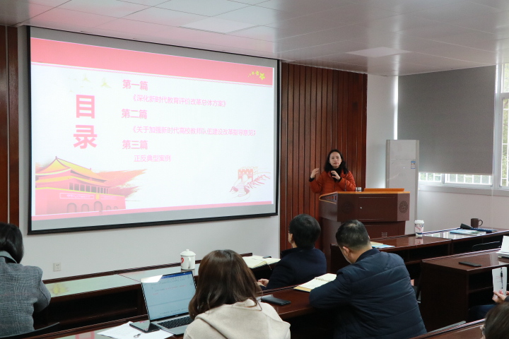 刘利剑以习总书记对师德师风建设的要求为引入,详细解读了《深化新时代教育评价改革总体方案》、《关于加强新时代高校教师队伍建设改革的指导意见》及教育部曝光的违反教师职业行为十项准则典型案例。刘利剑强调要将思想政治工作贯穿学校教育管理全过程,提升教师思想政治素质,加强课程思政建设,推动师德师风建设常态化、长效化,找准培养一流人才、产出一流成果的自我定位。