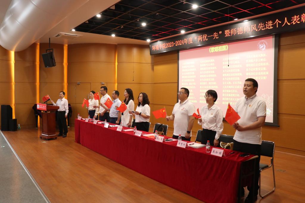 大会结束,全体起立齐唱《歌唱祖国》。一面面五星红旗飘扬在会场中,环境学院在此歌唱祖国繁荣富强,表彰先进思想模范,以饱满的热情与奋斗的姿态向党致敬。