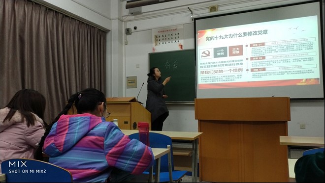 本科给排水党支部:2017年11月30日,毛娟老师为本科给排水党支部讲授微党课,给同学们讲解了此次党章修改的内容及其重点,并从党章的修改原因出发阐述了修改的意义,希望党员同志首先以做合格党员的目标严格要求自己,做到在党爱党、在党言党、在党为党。向同学们强调了新时代中国特色社会主义思想的内涵。毛娟老师还就高校思政工作联系实际与学生党员做交流,希望学生党员们能做好联系教师和学生的桥梁,增进师生之间的交流。此前在9月,谢鹏超老师也讲授了专题微党课,带领同学们学习了习总书记在高校思政工作会议上的讲话精神,向同学们强调了高校思想政治工作的重要性和学生党员的先锋模范作用,同时也表明了新时代高校为实现全程育人、全方位育人的决心。