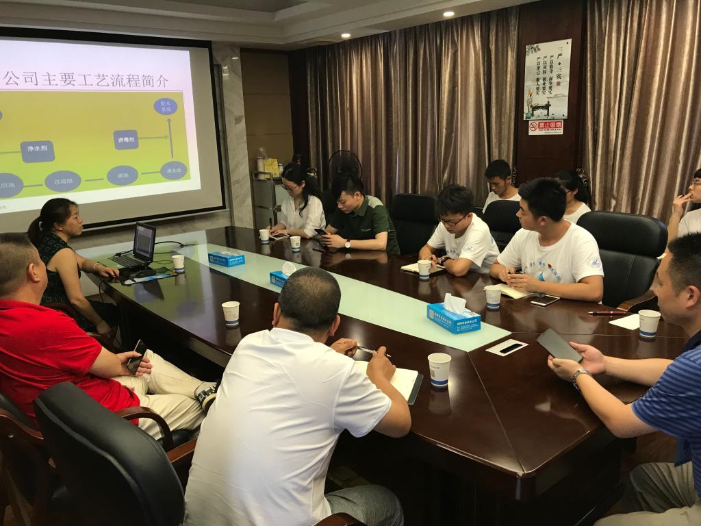 初临邵阳,座谈会上齐交流。7月12日实践队与自来水公司开展了座谈会,会上与公司副总周平安、质检中心主任贺红萍进行了气氛活跃的交谈,公司代表介绍了邵阳的发展历史和工业基础,同时详细地介绍了邵阳市自来水公司的历史渊源、发展现状和目前公司遇到的困难,同学们针对这些问题提出了初步看法,并进一步询问了水厂的运行状况、取水口位置和水域污染情况等专业问题,以便实践队的下一步行动。