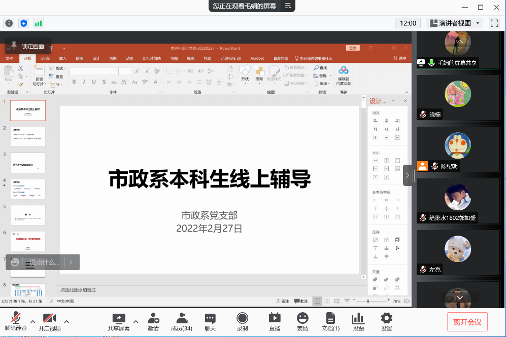 开学伊始,校园内疫情形势依然严峻,许多环境学子刚刚经历了宿舍隔离。为了缓解同学们的学习压力,2022年2月27日上午,教工市政党支部的教师发挥党员先锋作用,针对大四同学即将面对的考研复试以及低年级同学的科创竞赛等方面举行线上辅导交流会。会上市政系的各位老师与同学们展开了深入的交流,大家畅所欲言,讨论非常热烈。